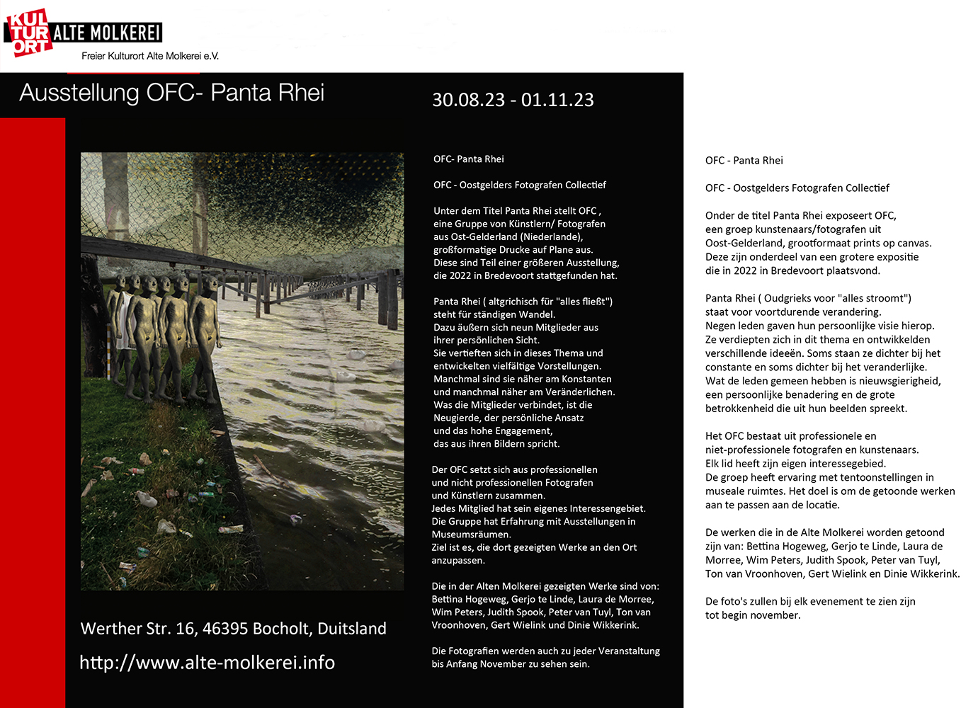 Constante verandering. Dat is waarop acht leden van het Oostgelders Fotografen Collectief hun persoonlijke visie geven. Het gebruikte motto Panta Rhei (“alles stroomt”) komt van de oud-Griekse wijsgeer Heraclitus die betoogde dat alles in constante verandering is. Hij noemde als voorbeeld de rivier die steeds ander water bevat en dus nooit hetzelfde is.